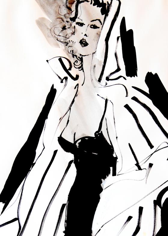 After returning back to NYC in 1958, Mickool was illustrating for various department stores and boutiques, including Lord & Taylor. During this time, Mickool met his wife Valerie Hall and was married in 1960. It was not until 1965 that Mickool truly captured the essence of Hood’s technique - producing a more steady involvement in the Lord & Taylor account. Desiring the Lord & Taylor image, Filene’s of Boston approached Mickool in the mid 1970’s to be their primary artist to replicate this image. He worked successfully with Filene’s through the mid to late 1970’s until Lord & Taylor expanded into the Boston area; forcing Filene’s to abandon the style that was originally created by Lord & Taylor. During this period of change, many fashion styles began to transition from wash drawings to the more modern line fashion drawings.